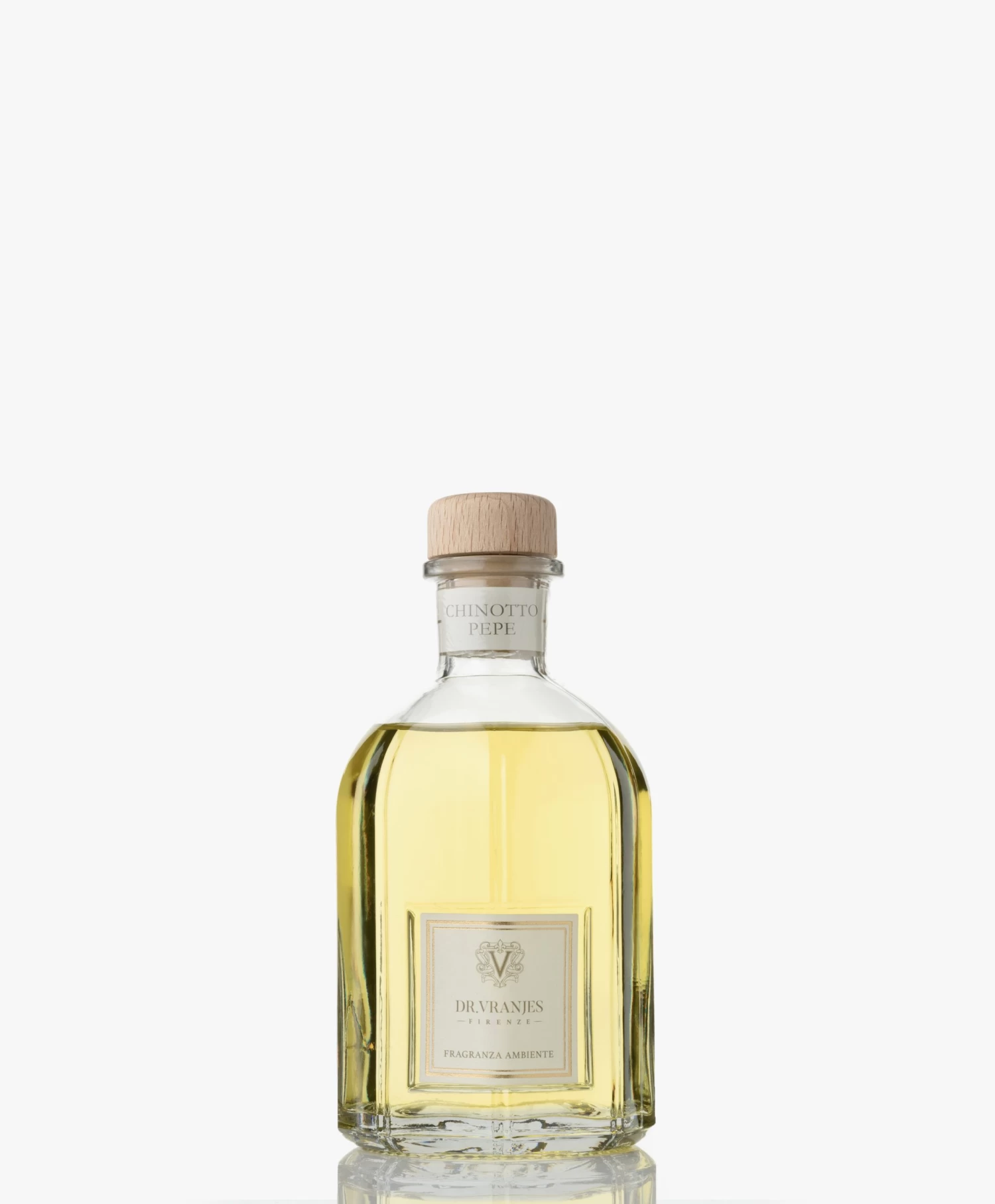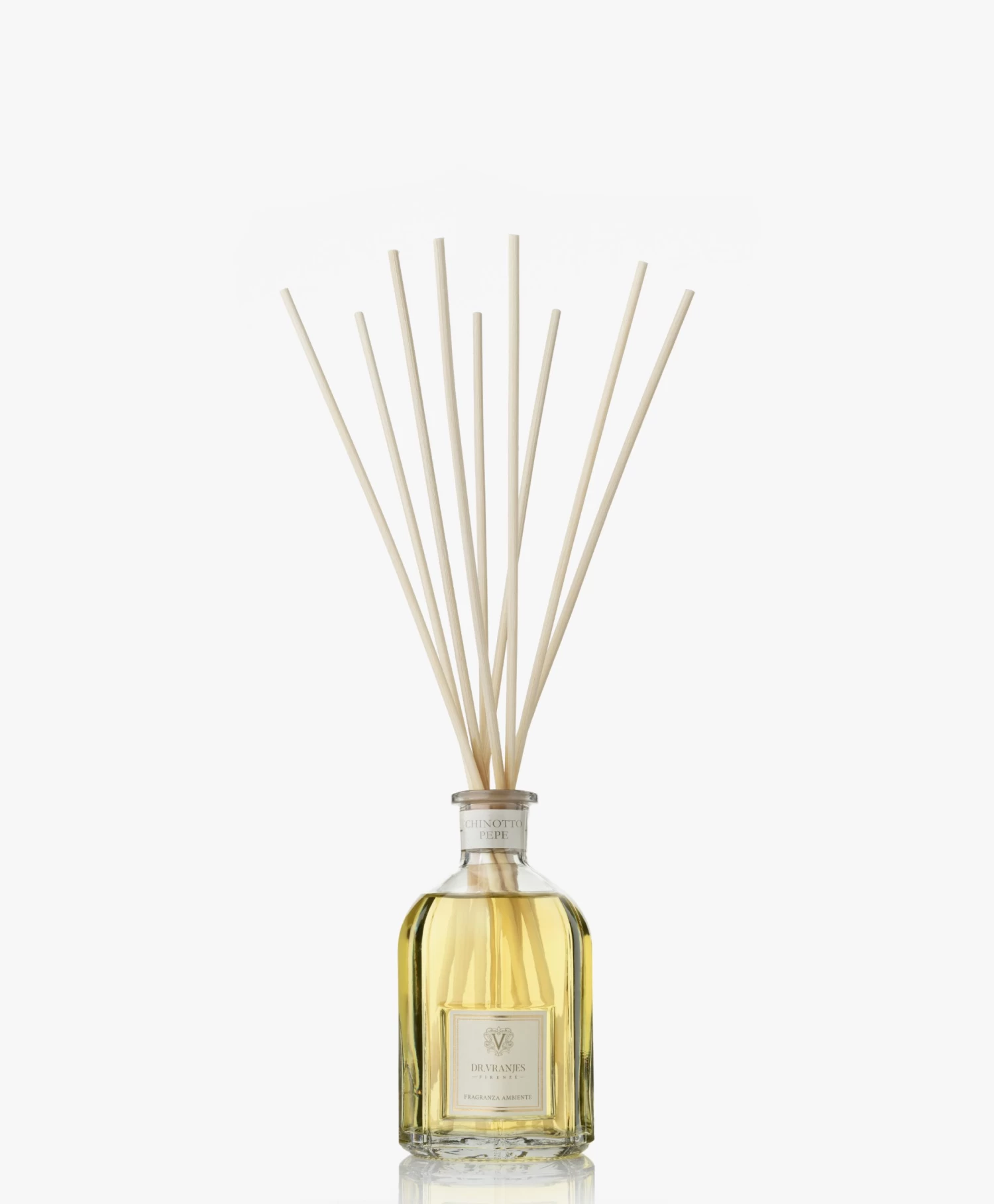 Breng warmte, comfort en luxe naar je huis met deze Dr. Vranjes geurstokjes in de delicate en unieke geur Chinotto Pepe. Een kruidige citrusgeur waarin chinotto, zwarte peper en kardemom de boventoon voeren – geïnspireerd op een jeugdherinnering van de eigenaar toen chinotto zijn favoriete drankje was. De geurstokjes zijn geproduceerd met natuurlijke ingrediënten en verfijnde essentiële oliën afkomstig uit de Toscaanse regionen rondom Florence, die gepresenteerd worden in handgemaakte glazen flacons met een klassieke doch eigentijdse vormgeving.