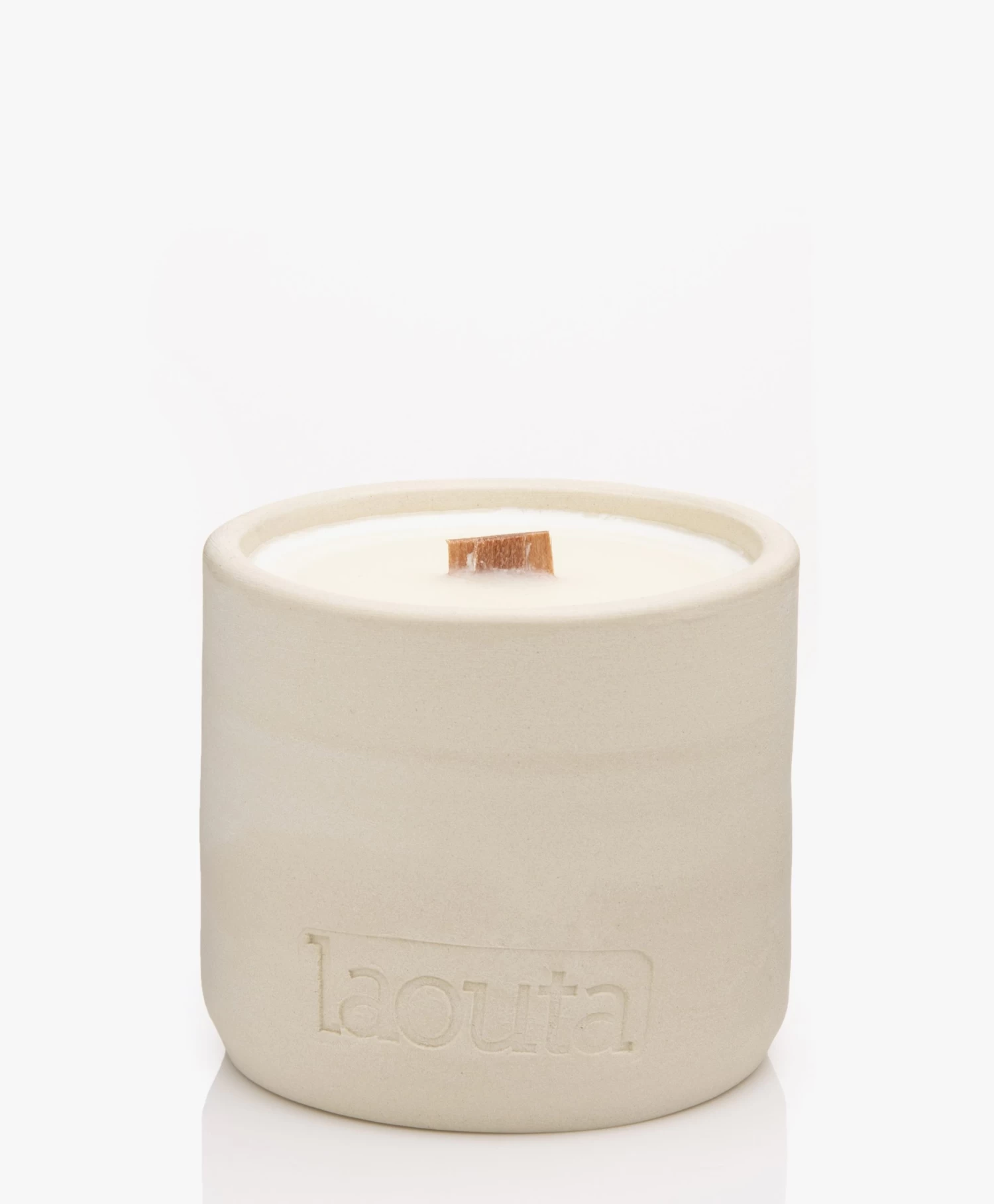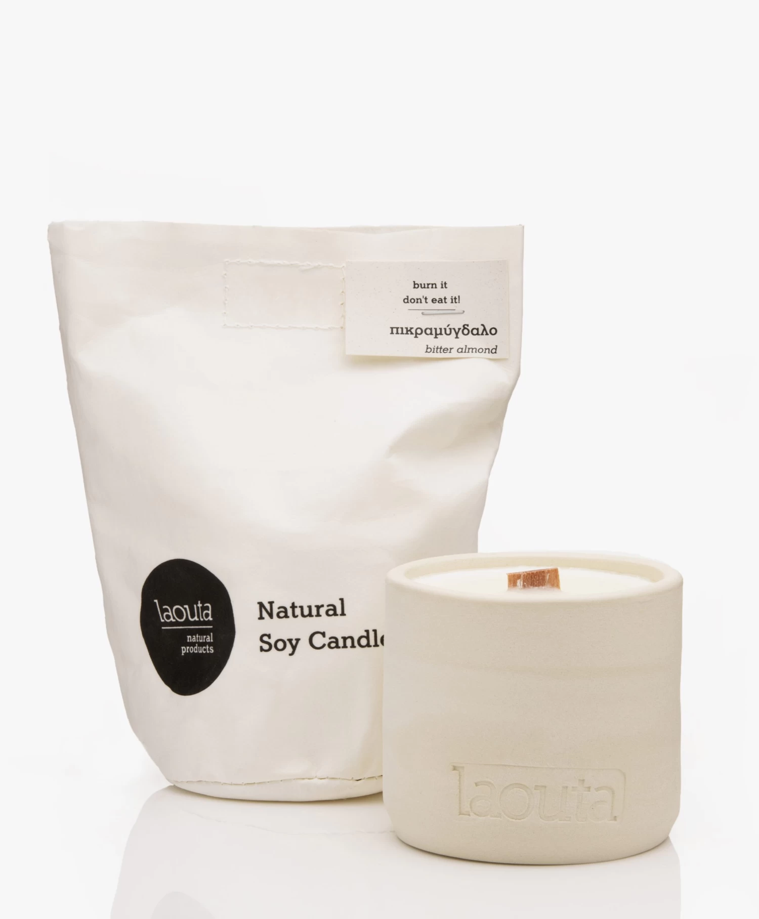 Parfumeer je huis op subtiele wijze met de heerlijke geurkaars van Laouta. Deze handgemaakte kaars is volledig vervaardigd van pure sojawas en komt met een houten lont en een handgemaakte keramische pot. Leuk ontwerpdetail: de kaars is verpakt in een papieren zak die gewassen én hergebruikt kan worden voor een stijlvol duurzaam ontwerp. Met de heerlijke Bittersweet Almond geur voor een sterke en zoete, ietwat bittere amandelgeur.