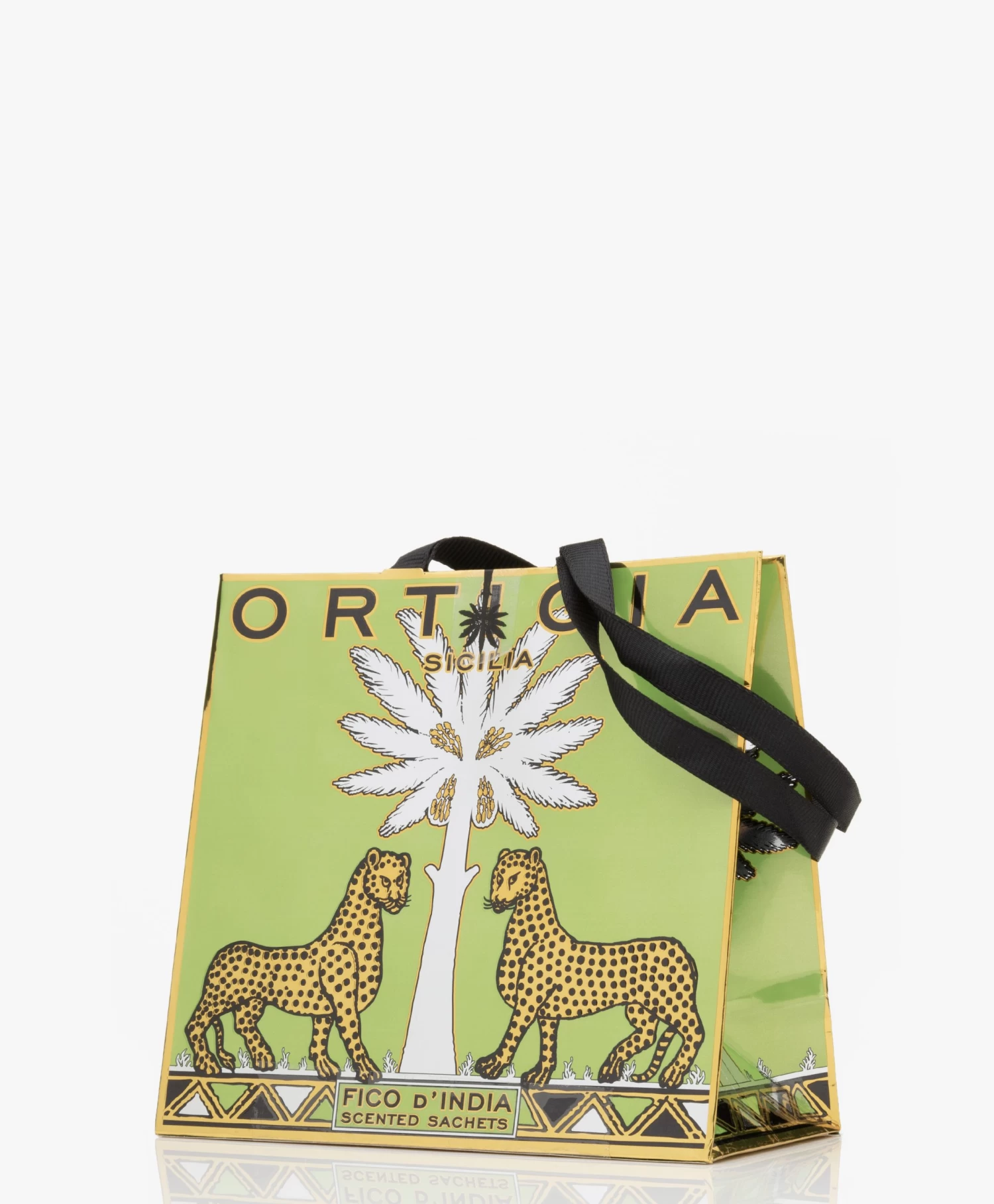 Met de Fico D’ India geurzakjes van Ortigia verrijk je lades en kasten, maar ook de auto, je bagage, het toilet of de badkamer met de rijke geur van cactus, ceder, vijgenblad en oranjebloesem. De set bevat 5 papieren enveloppen met prachtige illustraties en artwork waarin natuurlijke geparfumeerde minerale korrels de ruimte verfrissen.